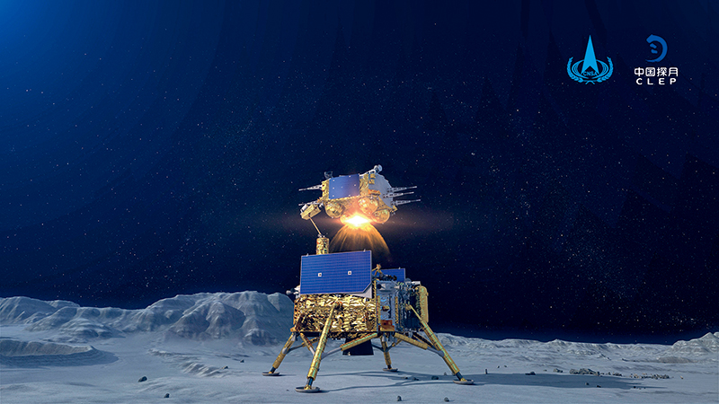 12月3日23時10分,嫦娥五號上升器月面點(diǎn)火,3000 牛發(fā)動機(jī)工作約6 分鐘后,順利將攜帶月壤的上升器送入到預(yù)定環(huán)月軌道,成功實(shí)現(xiàn)我國首次地外天體起飛。這是嫦娥五號上升器月面點(diǎn)火瞬間模擬 圖國家航天局供圖