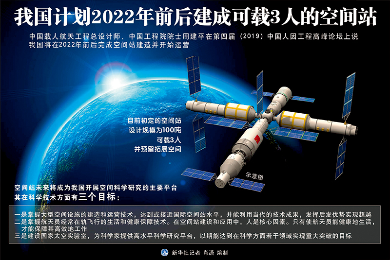 2022年前后,中國空間站將正式完成在軌建造任務。屆時,中國將在空間站上部署航天醫學、空間生命和生物、材料、微重力燃燒和流體、物理、天文等領域的高水平實驗設備,科學家可在空間站開展大量空間科學前沿領域的研究工作。