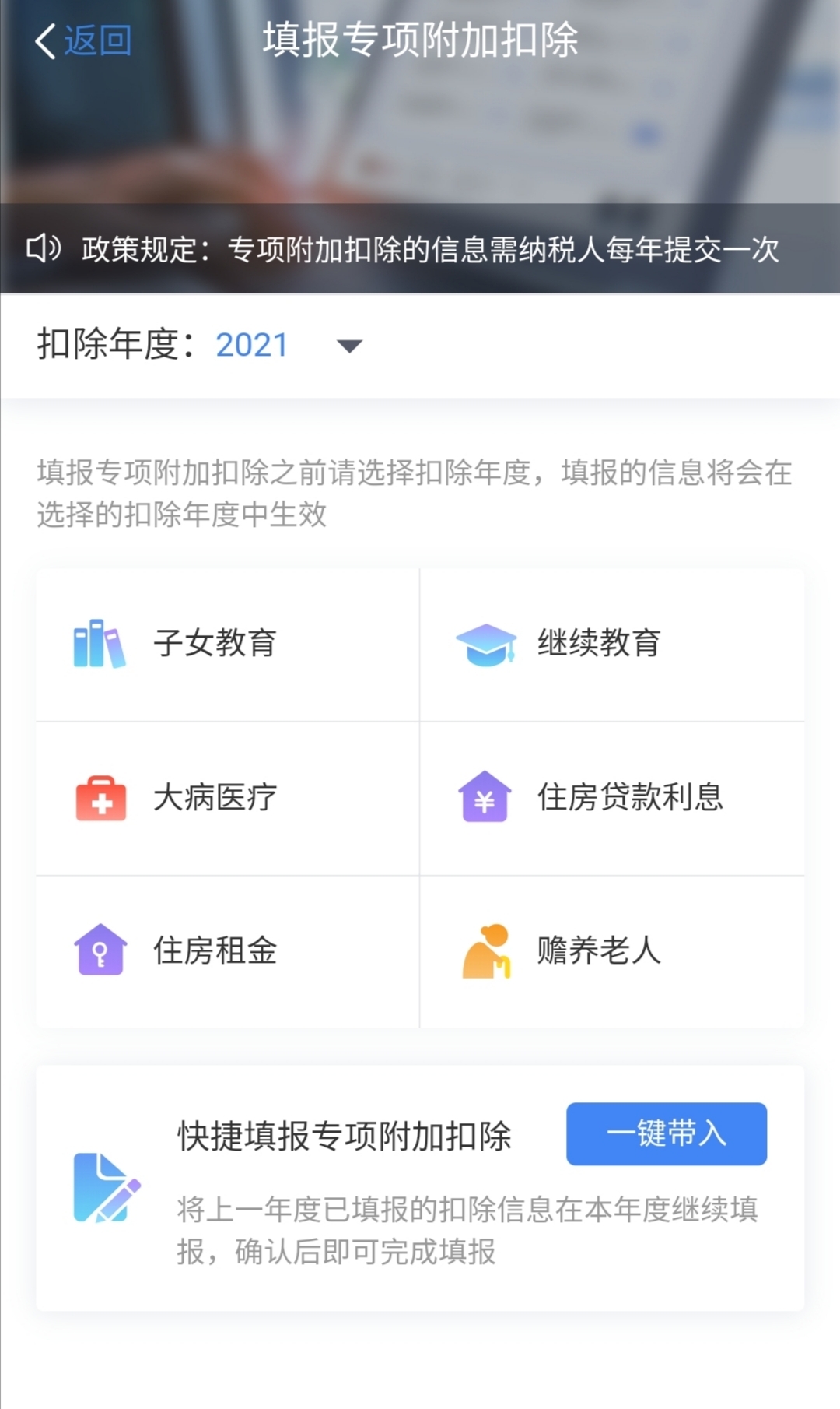 如何確認(rèn)?納稅人從APP首頁進(jìn)入“填報專項附加扣除”頁面后,既可以選擇一鍵帶入,即將上一年度已填報的扣除信息在本年度繼續(xù)填報,確認(rèn)后即可完成填報,也可以按目前自身實(shí)際情況逐項填報。若未及時確認(rèn),那么已填報的扣除信息將自動視同有效并延長至2021年。