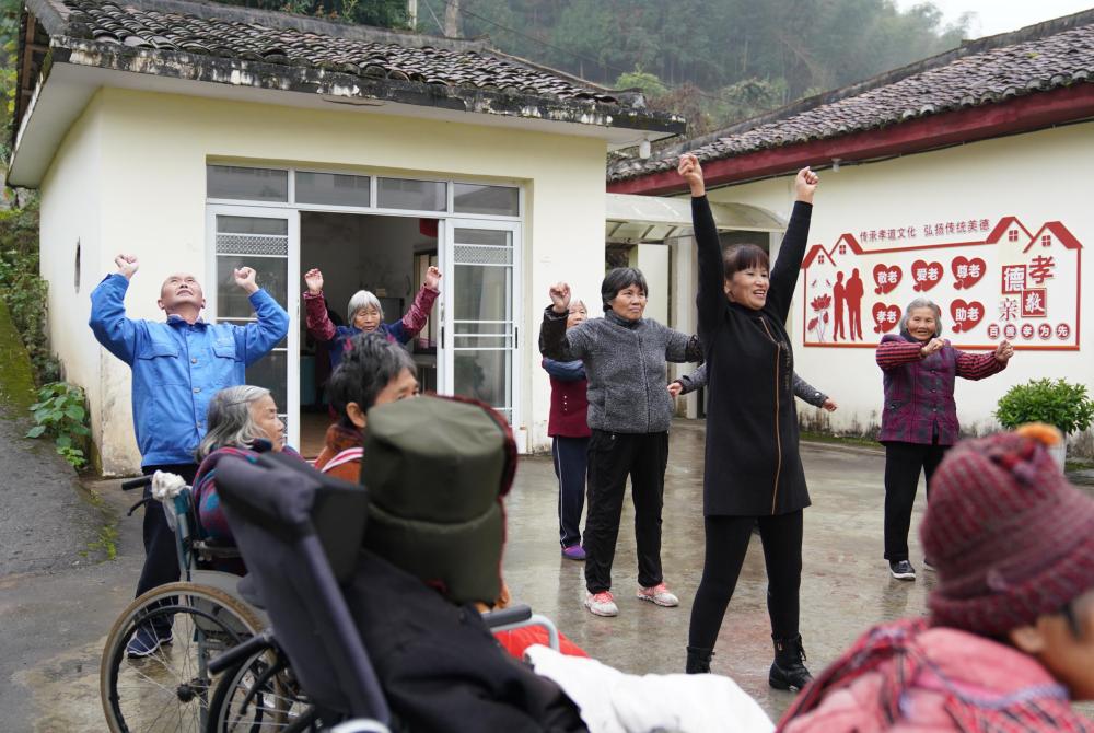 12月4日,在江西省撫州市黎川縣德勝鎮德勝村“幸福之家”養老服務站,工作人員帶領居民一起做操鍛煉身體。新華社記者 胡晨歡 攝