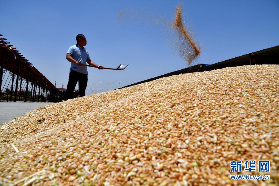 在山東省汶上縣郭倉鎮,種糧大戶郭波波在晾曬小麥(6月3日攝)。