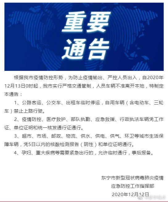 黑龍江東寧市新型冠狀病毒肺炎疫情應急防控工作指揮部消息:根據東寧市疫情防控形勢,為防止疫情輸出、嚴控人員出入,自2020年12月13日0時起,東寧市實行嚴格交通管制,人員車輛不準離開本地。