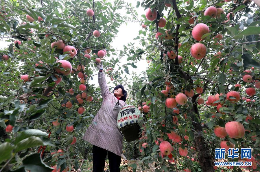 在石家莊市井陘縣孫莊鄉洛陽村蘋果園內,農戶在采摘蘋果(10月20日攝)。新華社發(梁子棟 攝)