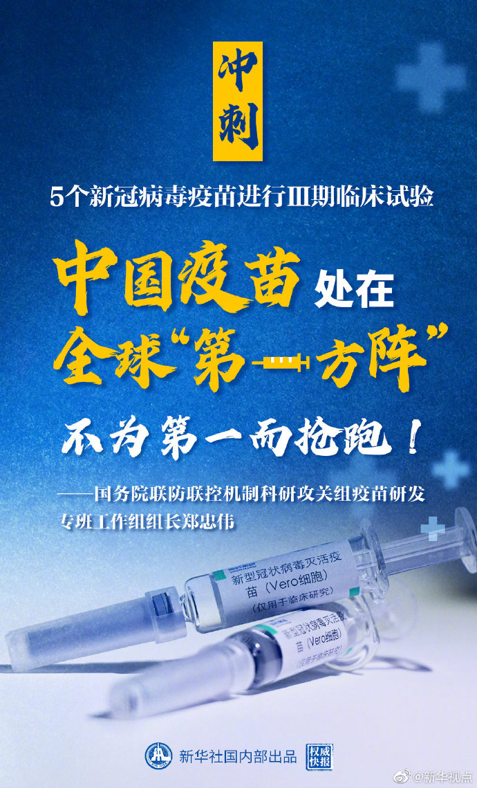 “我國目前已有5個新冠病毒疫苗進行Ⅲ期臨床試驗,數量位于全球前列。”國務院聯防聯控機制科研攻關組疫苗研發專班工作組組長鄭忠偉接受新華社記者專訪時說,“疫苗研發已經進入沖刺階段,我們處于全球第一方陣,但不為第一而搶跑。”“評價一個疫苗需要多項綜合指標,其中安全性、有效性、可及性、可負擔性是最重要的。”(記者:陳芳、董瑞豐 海報設計:張惠慧)