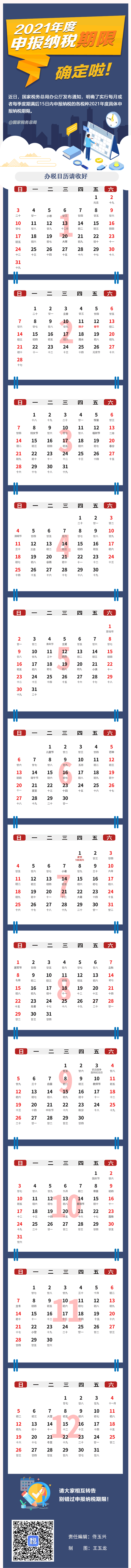 近日,國家稅務總局辦公廳發布《關于明確2021年度申報納稅期限的通知》(稅總辦函〔2020〕242號),明確實行每月或者每季度期滿后15日內申報納稅的各稅種2021年度具體申報納稅期限。為了方便納稅人每月查找辦稅日期,一張動圖送給你!快收藏起來吧~