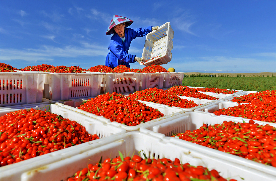 ????2020年7月19日,在甘肅省張掖市高臺縣黑泉鎮十壩村戈壁灘上,農民正在將采摘成框的枸杞裝車。鄭耀德 攝