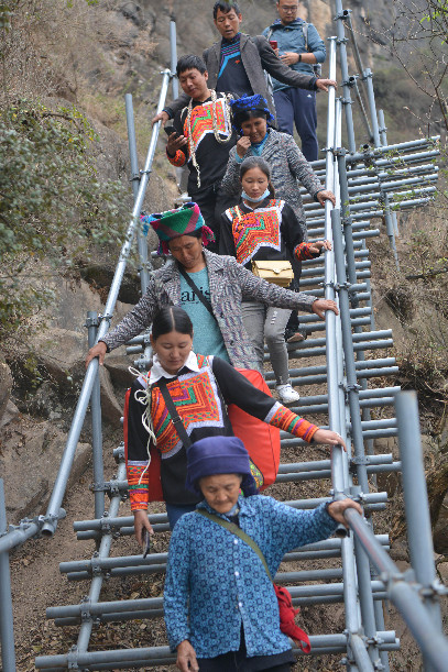 ????2020年5月13日,四川省涼山州昭覺縣支爾莫鄉阿土列爾村31戶村民帶著行李通過鋼梯下山,集中搬遷至昭覺縣易地扶貧搬遷縣城集中安置點的新家。阿土列爾村因位于垂直落差上千米的陡峭懸崖上,曾經村民上下山都要在巖壁上攀爬,從而被稱為“懸崖村”。5月14日前,全村84戶建檔立卡貧困戶將陸續搬進縣城新家。張浪 攝