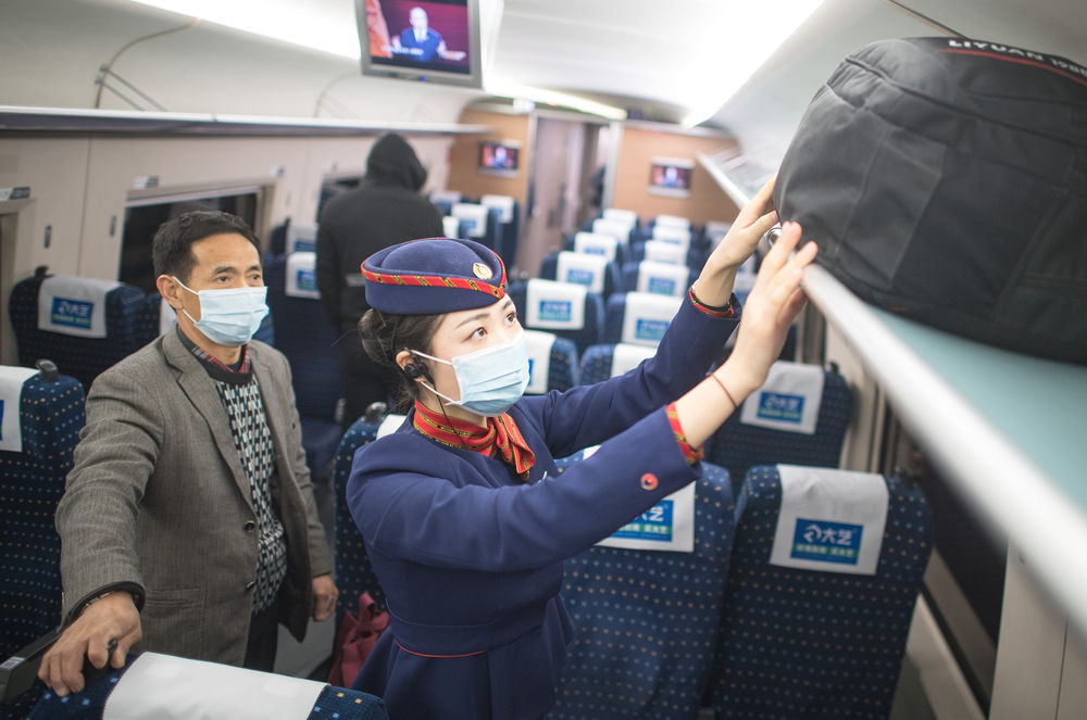 ??12月16日,武漢客運段高鐵乘務(wù)員艾婷婷在幫助旅客放行李。