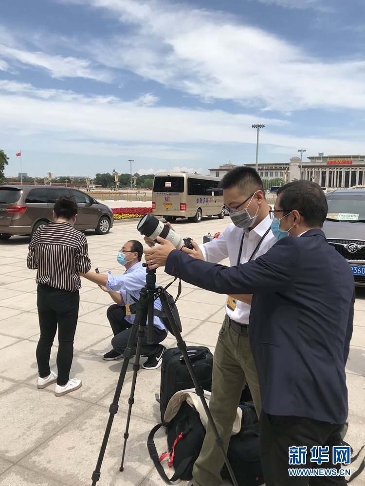 5月20日,全國政協十三屆三次會議召開新聞發布會。大會新聞發言人郭衛民向中外媒體介紹本次大會有關情況并回答記者提問。圖為本網記者在人民大會堂東門外廣場做直播前準備工作。新華網記者 周紅軍? 攝