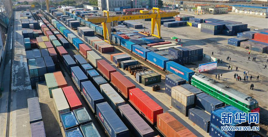 2月17日,中歐班列(南昌)在南昌向塘鐵路口岸等待發(fā)車(無人機照片)。 新華社記者 胡晨歡 攝