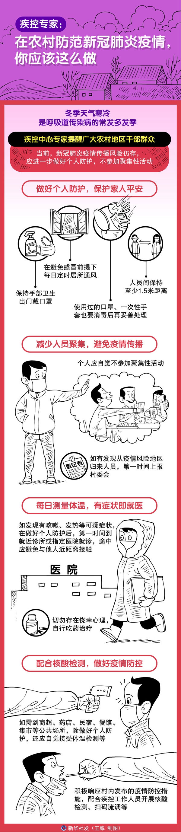配合核酸檢測,做好疫情防控。如需到商超、藥店、民宿、餐館、集市等公共場所,除做好個人防護,還應自覺接受體溫檢測等。同時,積極響應村內發布的疫情防控措施,配合疾控工作人員開展核酸檢測、掃碼流調等。