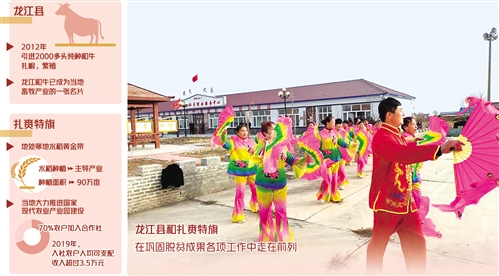 龍江縣是著名的雜糧產區、畜牧大縣。如今,龍江和牛已成為龍江縣畜牧產業的一張名片,帶領群眾走上致富路?!拔覀冄芯恐贫恕陡邫n肉牛優勢特色產業集群建設方案》,從2016年起出臺了扶持政策。”龍江縣委副書記孫立軍告訴記者,當地引導企業與農戶合作養牛,農戶每購買兩頭母牛,政府會給予一定的補貼款。此外,政府還向企業采購凍精幫助農戶繁育小牛,小牛犢生長到6個月達標后,由企業統一收購,價格在1.2萬元至1.4萬元不等。