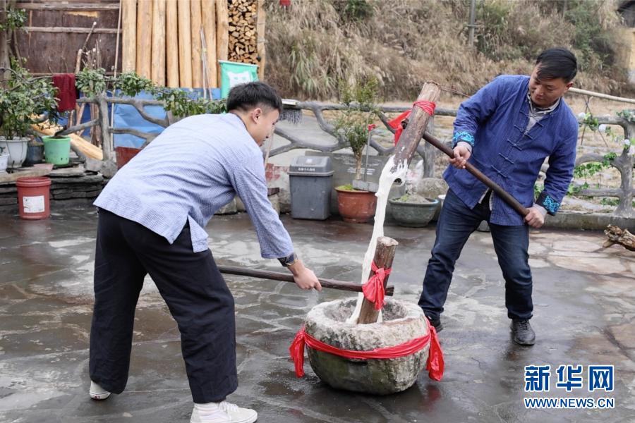 2月3日,在湖南省湘西土家族苗族自治州花垣縣十八洞村,村民在打糍粑,儲(chǔ)備過年物資。 新華社記者 陳思汗 攝