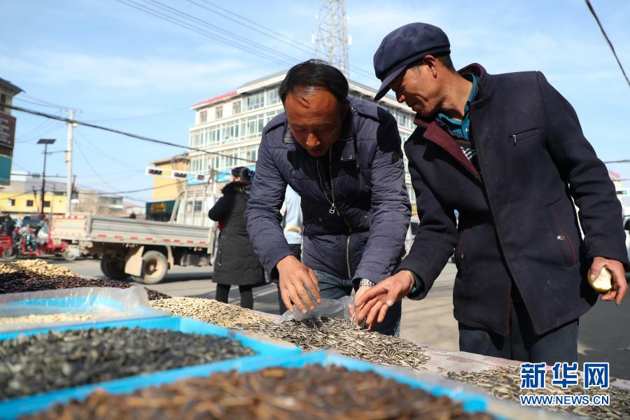 2月7日,在甘肅省定西市渭源縣會(huì)川鎮(zhèn)集市上,元古堆村村民曾玉成(右)在置辦年貨。 新華社記者 馬希平 攝