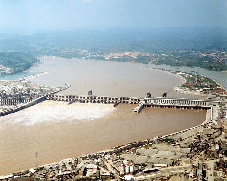 葛洲壩水利樞紐工程是萬里長江上建設的第一座大壩,它是三峽工程的反調節航運梯級,屬于三峽工程的一個組成部分。它位于湖北宜昌三峽出口南津關下游。長江出三峽峽谷后,水流由東驟然轉南,壩址處江面寬展至2200米。河面上有葛洲壩、西壩兩島,把長江分為大江、二江和三江。葛洲壩水利樞紐工程橫跨大江、葛洲壩、二江、西壩和三江,由船閘、電站廠房、泄水閘、沖沙閘及擋水建筑物組成。一、二號兩座船閘可通過載重為1.2萬至1.6萬噸的船隊。三號船閘可通過3000噸以下的客貨輪。兩座電站的廠房,分設在二江和大江,電站總裝機容量為271.5萬千瓦。擋水大壩全長2595米,最大壩高47米,水庫庫容約15.8億立方米。