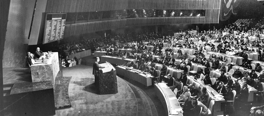1971年9月,第二十六屆聯(lián)合國(guó)大會(huì)召開(kāi)。從10月18日開(kāi)始,聯(lián)合國(guó)大會(huì)就恢復(fù)中華人民共和國(guó)在聯(lián)合國(guó)的代表權(quán)問(wèn)題進(jìn)行了一周的激烈辯論。10月25日,第二十六屆聯(lián)合國(guó)大會(huì)表決剛一結(jié)束,紐約聯(lián)合國(guó)會(huì)議大廳里立刻一片沸騰,雷鳴般的掌聲和歡呼聲一浪高過(guò)一浪,此起彼伏,經(jīng)久不息。新聞媒介評(píng)論道:“中國(guó)是在自己不在場(chǎng)的情況下,受到聯(lián)大三分之二以上國(guó)家的祝福,使聯(lián)合國(guó)發(fā)生根本變化。”