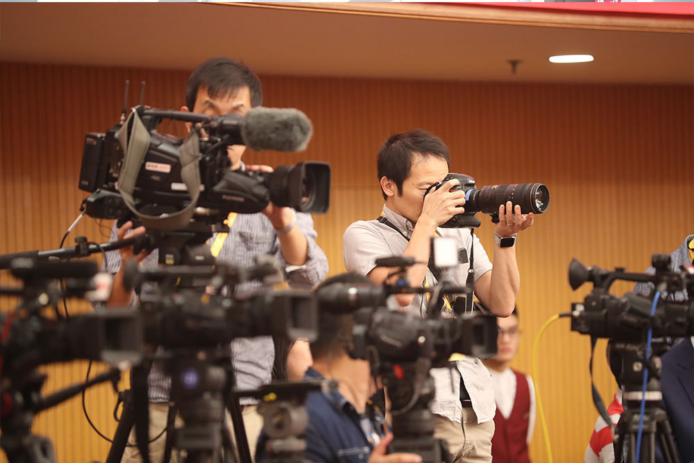 ???? 9月24日,慶祝中華人民共和國(guó)成立70周年活動(dòng)新聞中心在北京梅地亞中心二層新聞發(fā)布廳舉辦第一場(chǎng)新聞發(fā)布會(huì)。圖為新聞發(fā)布會(huì)現(xiàn)場(chǎng)記者。新華網(wǎng)記者 陳競(jìng)超 攝
