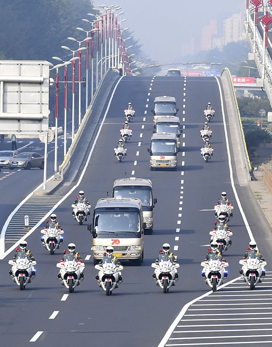 29日上午,國(guó)家勛章和國(guó)家榮譽(yù)稱(chēng)號(hào)獲得者集體乘坐禮賓車(chē)從住地出發(fā),在英姿颯爽的國(guó)賓護(hù)衛(wèi)隊(duì)護(hù)衛(wèi)下,匯成一列車(chē)隊(duì),向人民大會(huì)堂進(jìn)發(fā)。