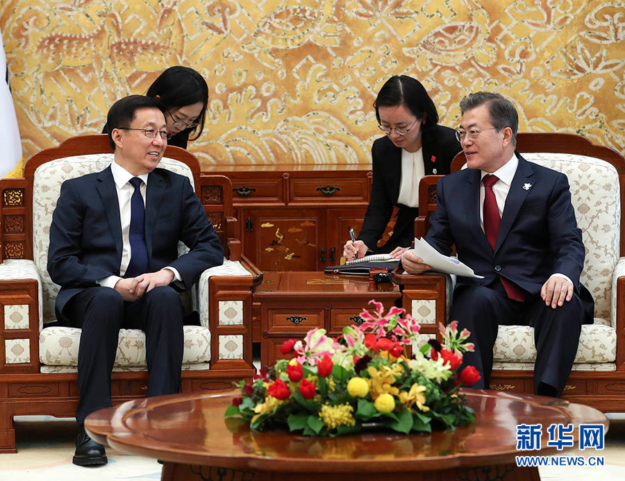 2月8日,應邀出席韓國平昌冬奧會開幕式的習近平主席特別代表、中共中央政治局常委韓正在首爾青瓦臺會見韓國總統(tǒng)文在寅。 新華社記者 龐興雷 攝