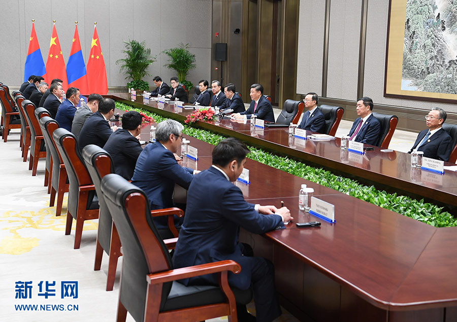 習近平指出,中蒙是山水相連的近鄰。中蒙關系發展符合兩國人民根本利益。我贊賞總統先生就任后多次表示重視中蒙關系,愿推動中蒙全面戰略伙伴關系不斷發展。中方愿同蒙方一道,本著互信、合作、共贏原則,把握機遇,排除干擾,扎實開展各領域交往和合作,豐富中蒙全面戰略伙伴關系內涵,開創兩國合作新局面。