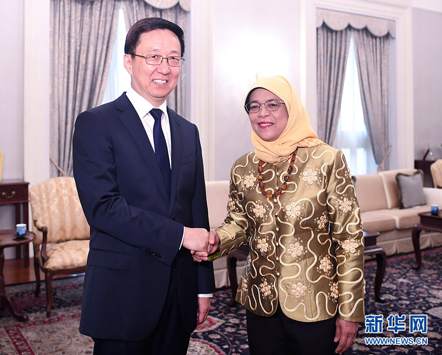 在同新方領導人會見時,韓正轉達了習近平主席、李克強總理對哈莉瑪總統、李顯龍總理的親切問候,哈莉瑪和李顯龍表示感謝并請韓正轉達他們對中國領導人的良好祝愿。