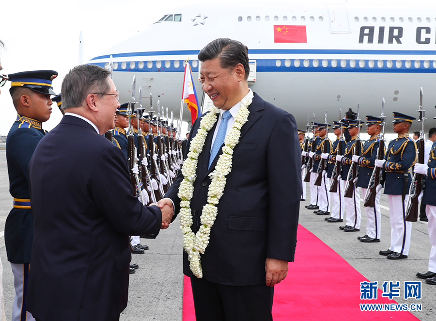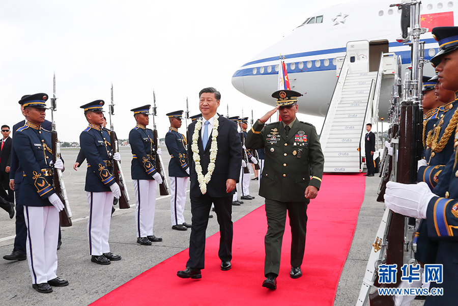 當地時間上午11時45分許,習近平乘坐專機抵達馬尼拉阿基諾國際機場。習近平步出艙門,菲律賓政府高級官員在舷梯旁熱情迎接,軍樂隊奏迎賓曲。禮兵分列紅地毯兩側。菲律賓青年向習近平獻上茉莉花環。
