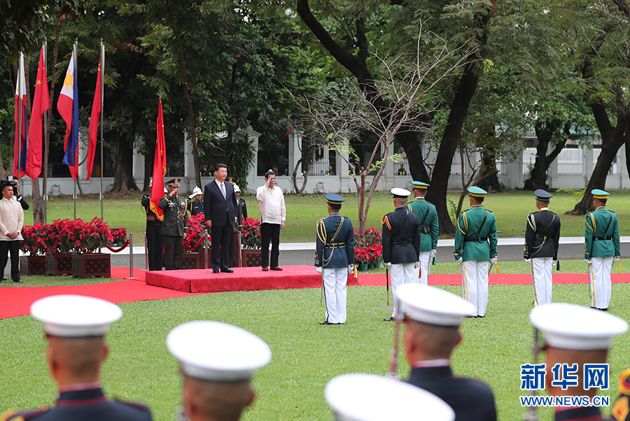 會談開始前,習近平出席杜特爾特在總統(tǒng)府前草坪舉行的隆重歡迎儀式。