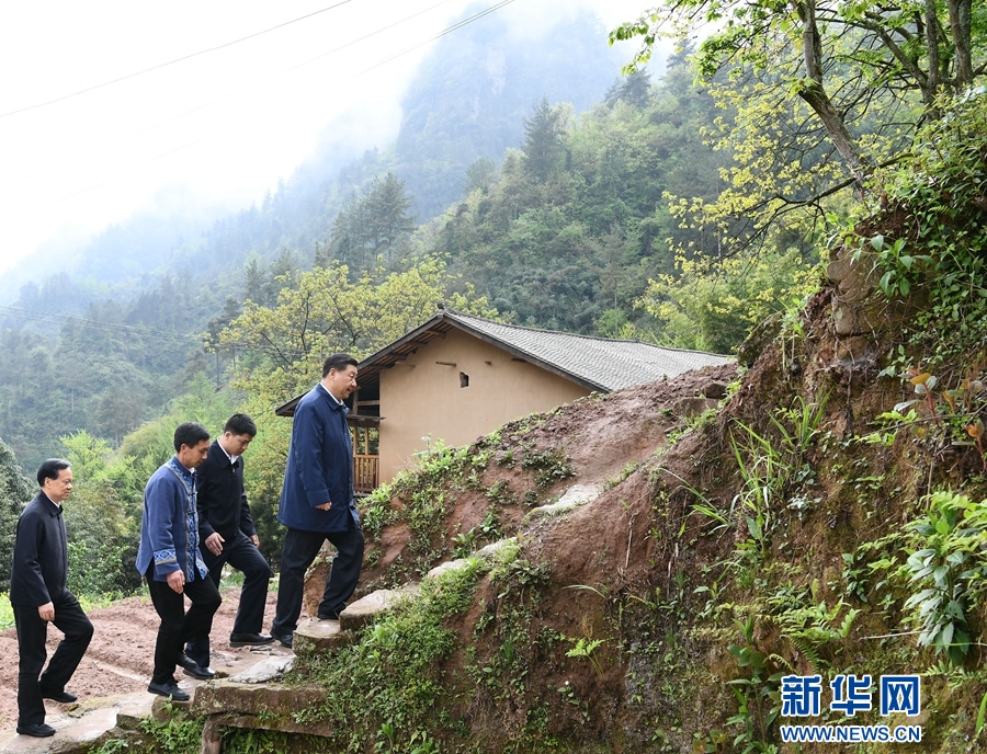 這是4月15日下午,在石柱土家族自治縣中益鄉華溪村,習近平踏著濕滑的石階登上陡坡,前往貧困戶譚登周家看望。 新華社記者 謝環馳 攝