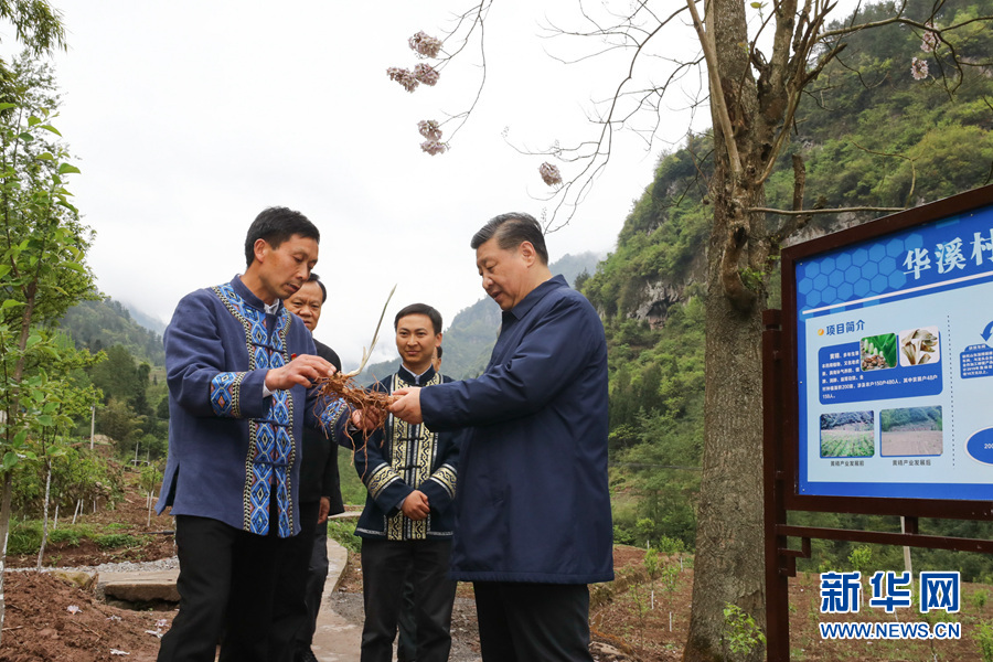 這是4月15日下午,習近平在石柱土家族自治縣中益鄉華溪村了解該村通過種植中藥材黃精等特色經濟作物帶動村民脫貧的情況。 新華社記者 鞠鵬 攝