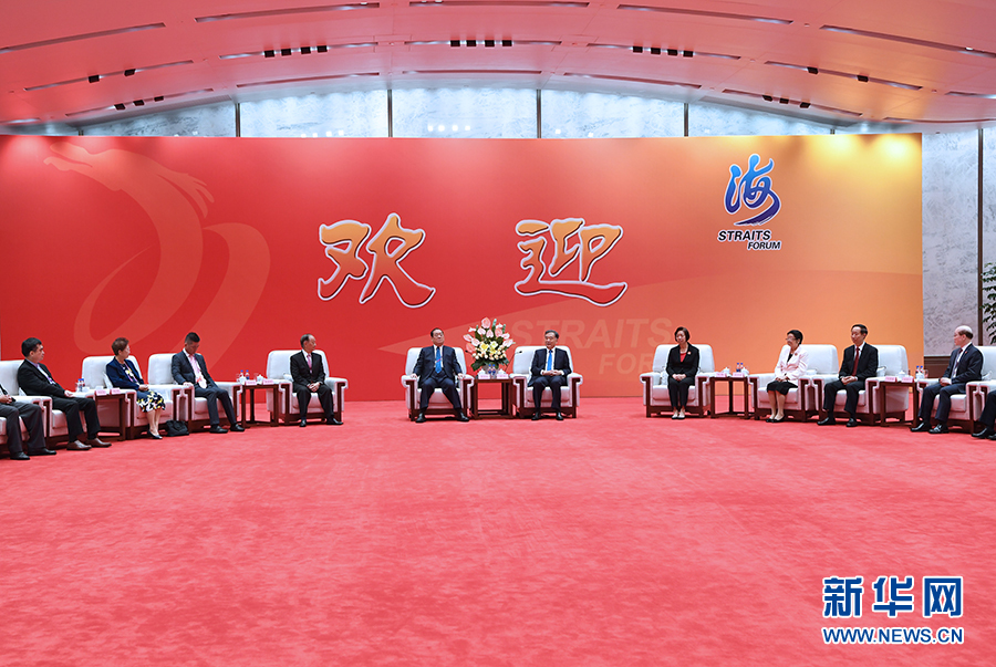 6月16日,中共中央政治局常委、全國政協主席汪洋在廈門出席第十一屆海峽論壇并致辭。這是論壇開幕前,汪洋會見出席論壇的部分兩岸嘉賓和主辦單位代表。 新華社記者 饒愛民 攝