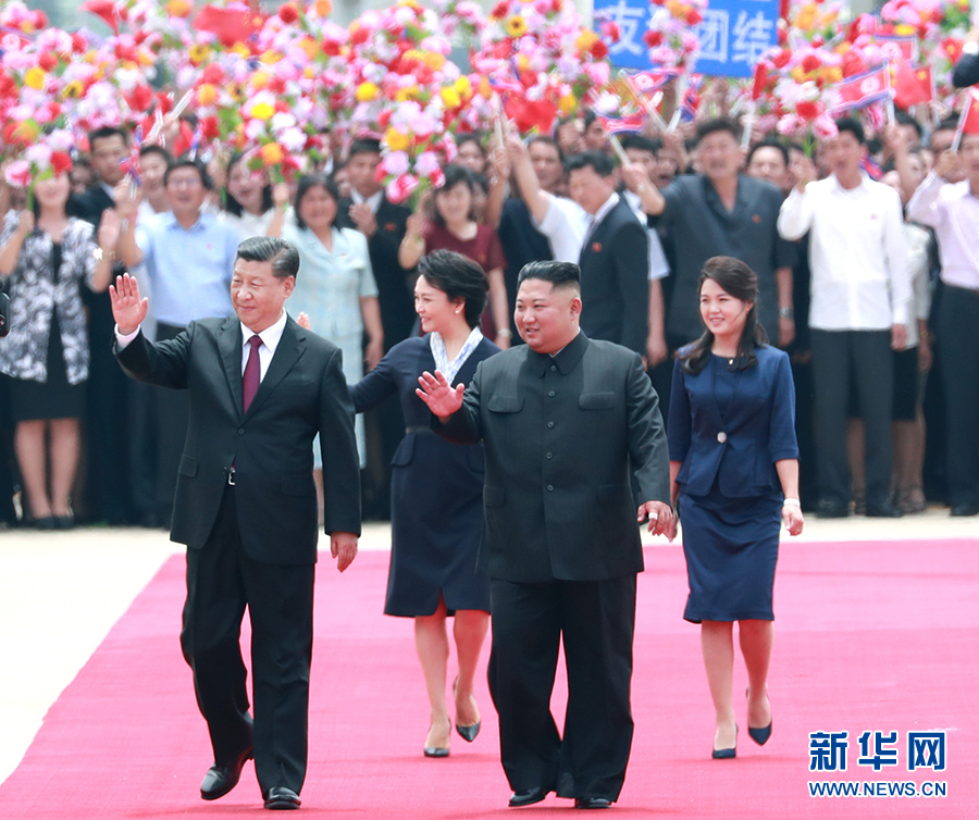 6月20日,中共中央總書記、國家主席習近平乘專機抵達平壤,開始對朝鮮民主主義人民共和國進行國事訪問。朝鮮勞動黨委員長、國務委員會委員長金正恩和夫人李雪主到機場熱情迎接習近平和夫人彭麗媛。朝方在機場舉行隆重歡迎儀式。歡迎儀式結束后,習近平與金正恩同車前往錦繡山太陽宮廣場,沿途數十萬群眾夾道歡迎。 新華社記者 申宏 攝