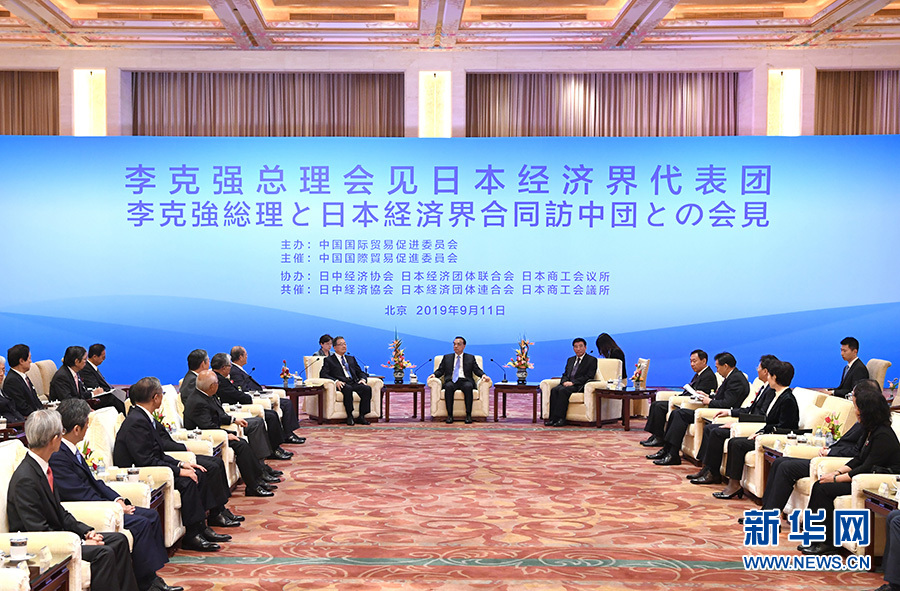 9月11日,國務院總理李克強在北京釣魚臺國賓館會見日中經濟協會會長宗岡正二、日本商工會議所會長三村明夫、日本經濟團體聯合會審議員會議長古賀信行率領的日本經濟界代表團并同他們座談交流。 新華社記者 饒愛民 攝