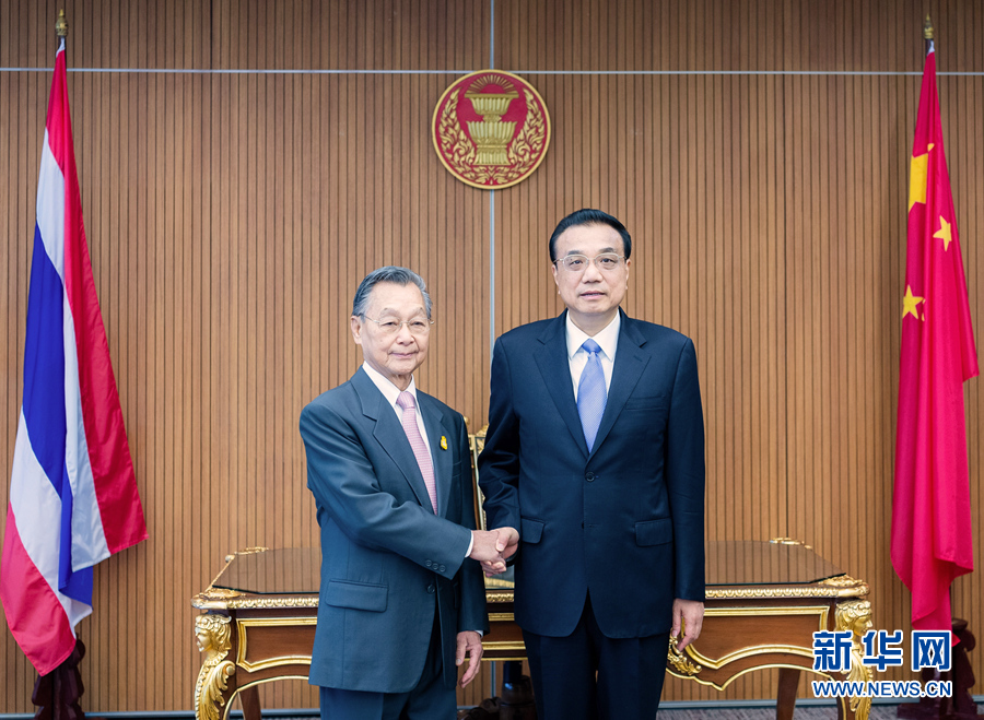 當?shù)貢r間11月5日上午,國務(wù)院總理李克強在曼谷新國會大廈會見泰國國會主席兼下議院議長川·立派。 新華社記者 翟健嵐 攝
