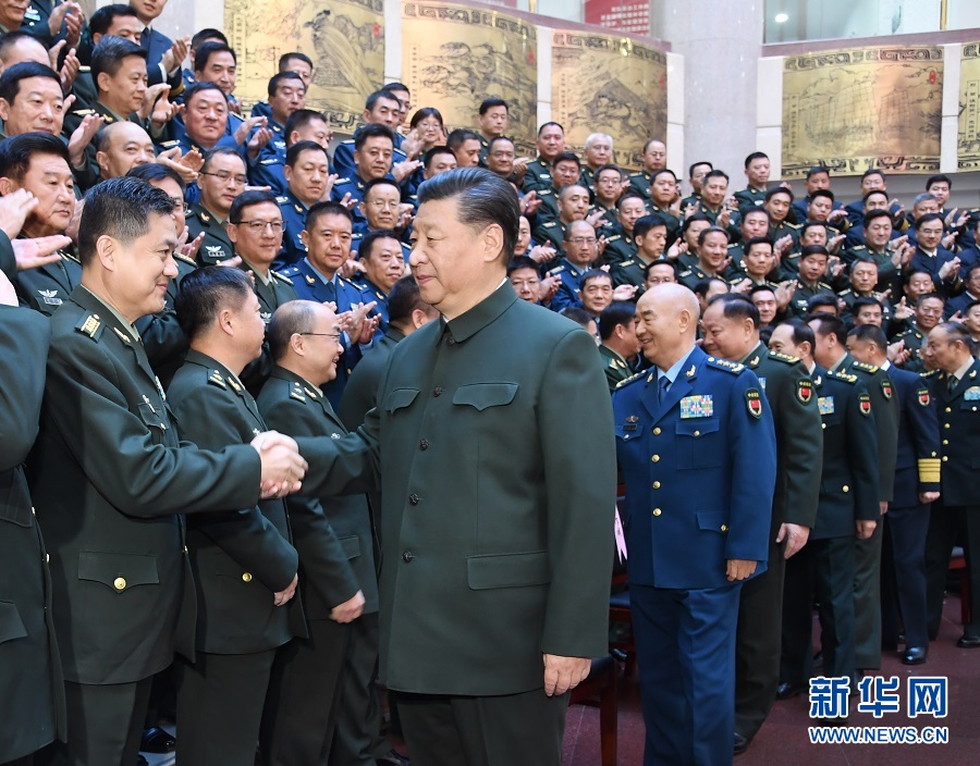 11月27日上午,全軍院校長集訓在國防大學開班。中共中央總書記、國家主席、中央軍委主席習近平出席開班式并發表重要講話,代表黨中央和中央軍委,向全軍院校長和軍事教育戰線的同志們致以誠摯問候。這是習近平親切接見集訓班全體學員。 新華社記者 李剛 攝