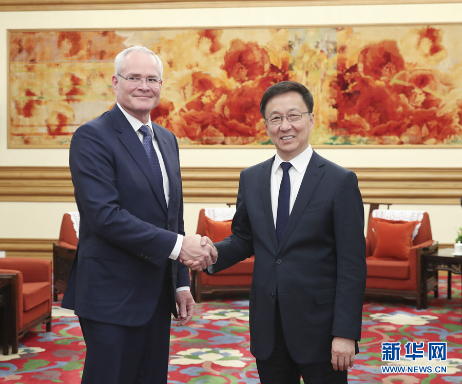 12月3日,中共中央政治局常委、國務院副總理韓正在北京中南海會見美國埃克森美孚公司董事長兼首席執行官伍德倫。 新華社記者 丁海濤 攝