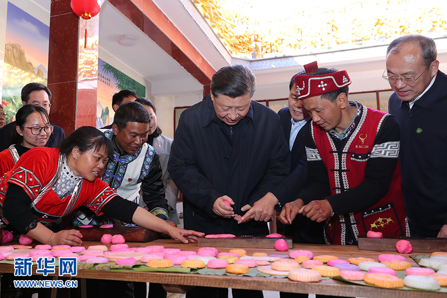 習近平來到村民李發順家,一一察看客廳、臥室、廚房、衛生間、豬舍等,了解居住環境。隨后,習近平在院子里同李發順一家制作當地節日傳統食品大米粑粑,并聊起家常,詳細詢問李發順一家脫貧情況。李發順告訴總書記,以前因為缺少勞動力,加上兩個孩子要上學,生活一度十分困難。這幾年通過養豬、碾米、外出打工等,收入提高了不少,2017年已經脫貧,一家人都參加了城鄉居民基本醫療保險,孩子有學上,房子干凈結實,生活越過越紅火。習近平聽了十分高興。他指出,鄉親們脫貧只是邁向幸福生活的第一步,是新生活、新奮斗的起點。要在全面建成小康社會基礎上,大力推進鄉村振興,讓幸福的佤族村更加幸福。