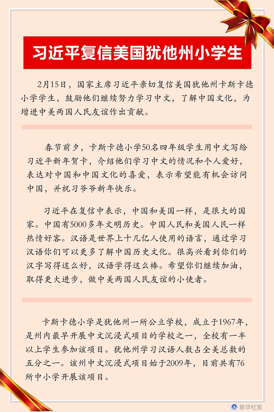 新華社北京2月22日電? 2月15日,國家主席習近平親切復信美國猶他州卡斯卡德小學學生,鼓勵他們繼續努力學習中文,了解中國文化,為增進中美兩國人民友誼作出貢獻。