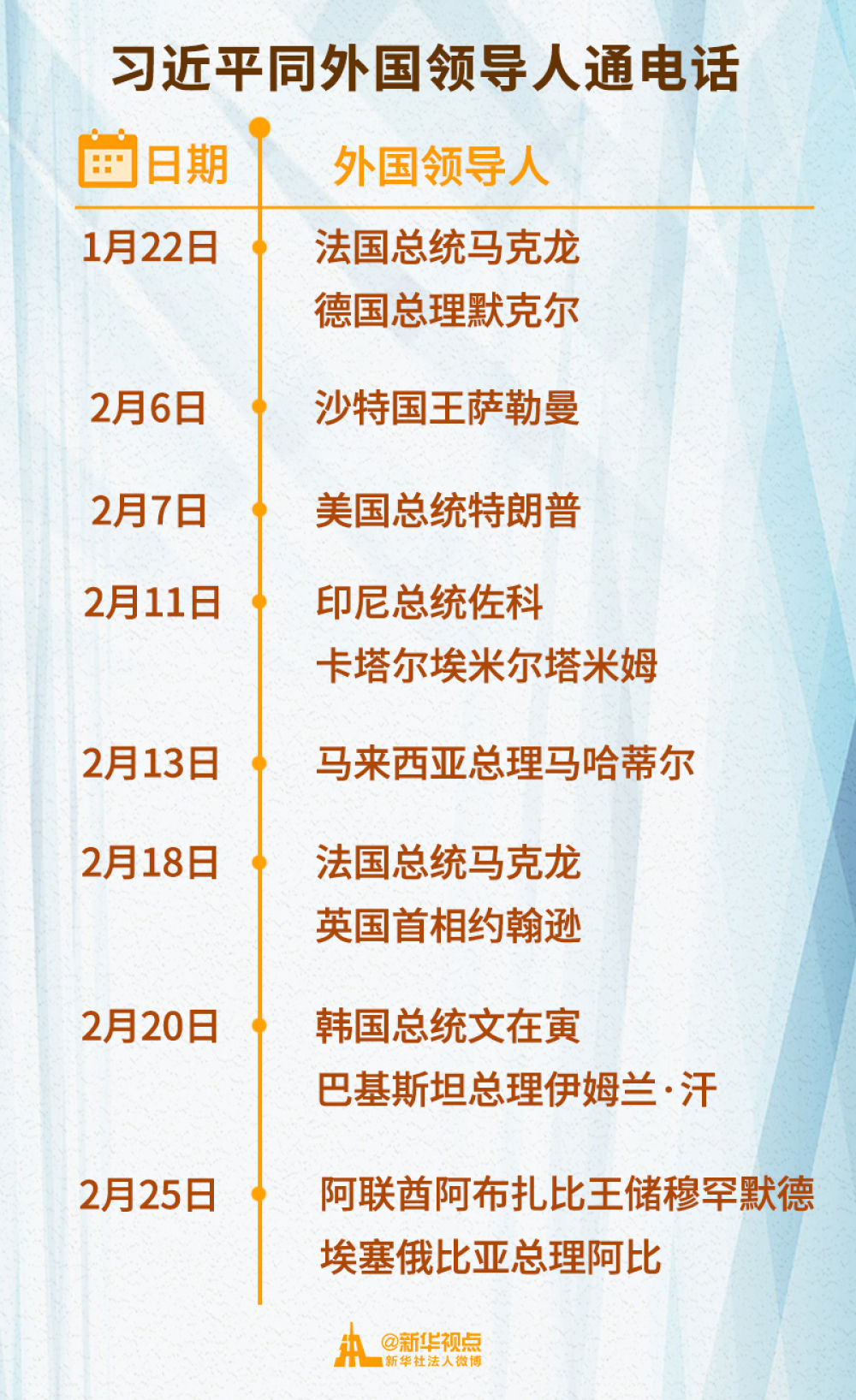2月以來(lái),習(xí)近平主席已先后同11位外國(guó)領(lǐng)導(dǎo)人通電話,涉及國(guó)家遍及亞洲、歐洲、非洲、美洲等地區(qū)。