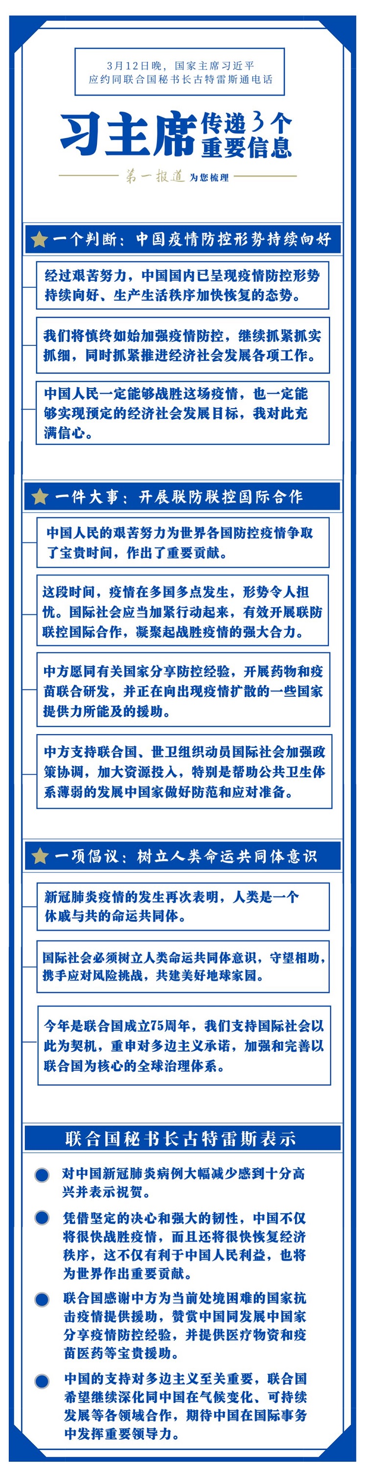 對疫情防控國際合作這件大事,習主席一直十分關心。此前,在內外事活動中,他曾多次提及。這一次同古特雷斯通電話,習主席有更明確闡述。