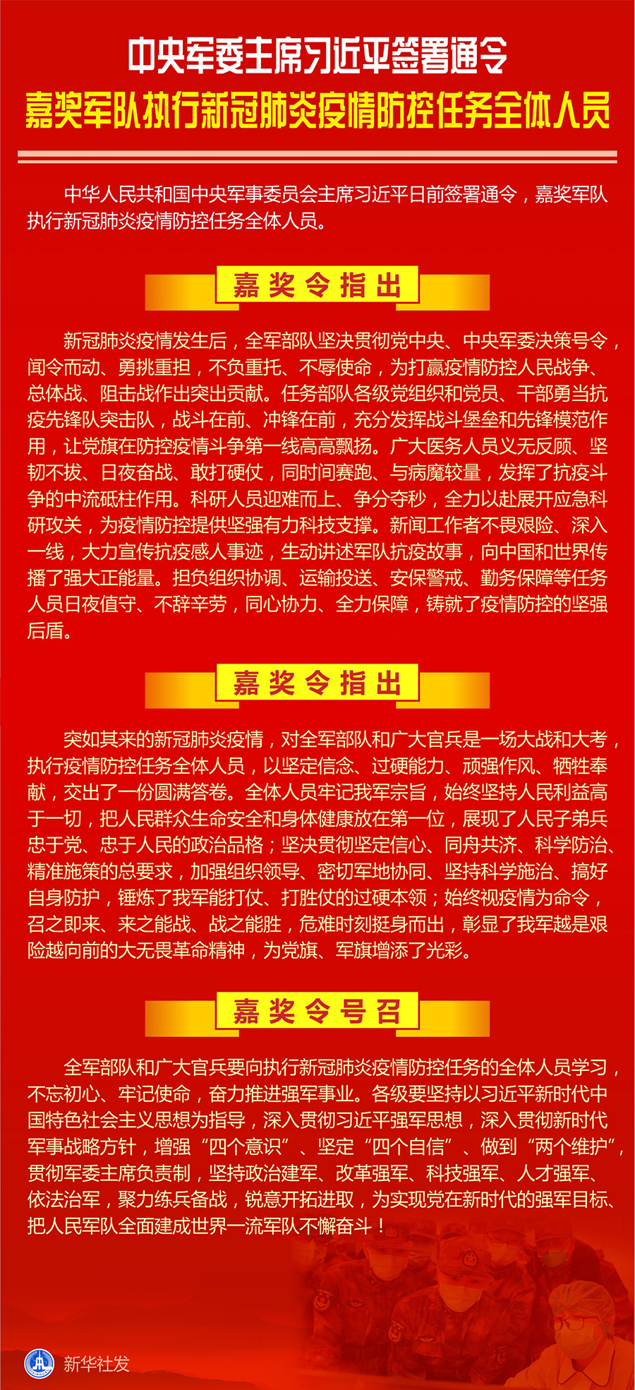 嘉獎令指出,新冠肺炎疫情發生后,全軍部隊堅決貫徹黨中央、中央軍委決策號令,聞令而動、勇挑重擔,不負重托、不辱使命,為打贏疫情防控人民戰爭、總體戰、阻擊戰作出突出貢獻。任務部隊各級黨組織和黨員、干部勇當抗疫先鋒隊突擊隊,戰斗在前、沖鋒在前,充分發揮戰斗堡壘和先鋒模范作用,讓黨旗在防控疫情斗爭第一線高高飄揚。廣大醫務人員義無反顧、堅韌不拔、日夜奮戰、敢打硬仗,同時間賽跑、與病魔較量,發揮了抗疫斗爭的中流砥柱作用。科研人員迎難而上、爭分奪秒,全力以赴展開應急科研攻關,為疫情防控提供堅強有力科技支撐。新聞工作者不畏艱險、深入一線,大力宣傳抗疫感人事跡,生動講述軍隊抗疫故事,向中國和世界傳播了強大正能量。擔負組織協調、運輸投送、安保警戒、勤務保障等任務人員日夜值守、不辭辛勞,同心協力、全力保障,鑄就了疫情防控的堅強后盾。