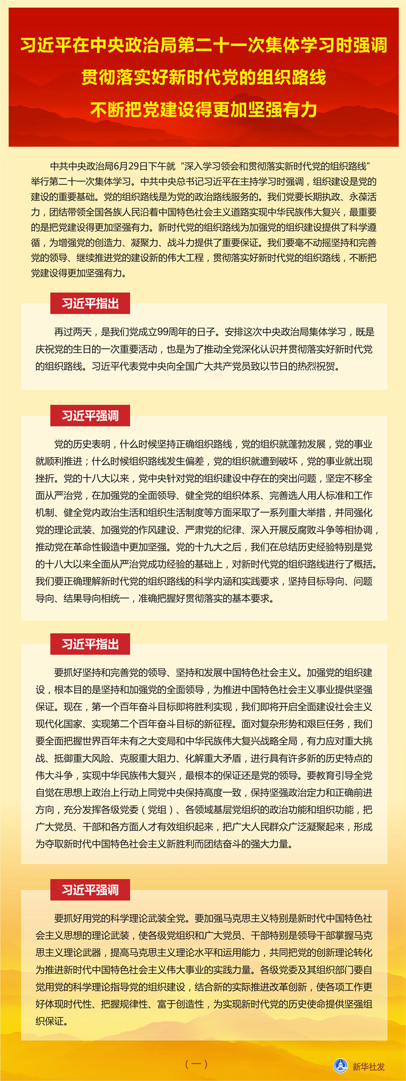 新華社北京6月30日電 中共中央政治局6月29日下午就“深入學習領會和貫徹落實新時代黨的組織路線”舉行第二十一次集體學習。中共中央總書記習近平在主持學習時強調,組織建設是黨的建設的重要基礎。黨的組織路線是為黨的政治路線服務的。我們黨要長期執政、永葆活力,團結帶領全國各族人民沿著中國特色社會主義道路實現中華民族偉大復興,最重要的是把黨建設得更加堅強有力。新時代黨的組織路線為加強黨的組織建設提供了科學遵循,為增強黨的創造力、凝聚力、戰斗力提供了重要保證。我們要毫不動搖堅持和完善黨的領導、繼續推進黨的建設新的偉大工程,貫徹落實好新時代黨的組織路線,不斷把黨建設得更加堅強有力。