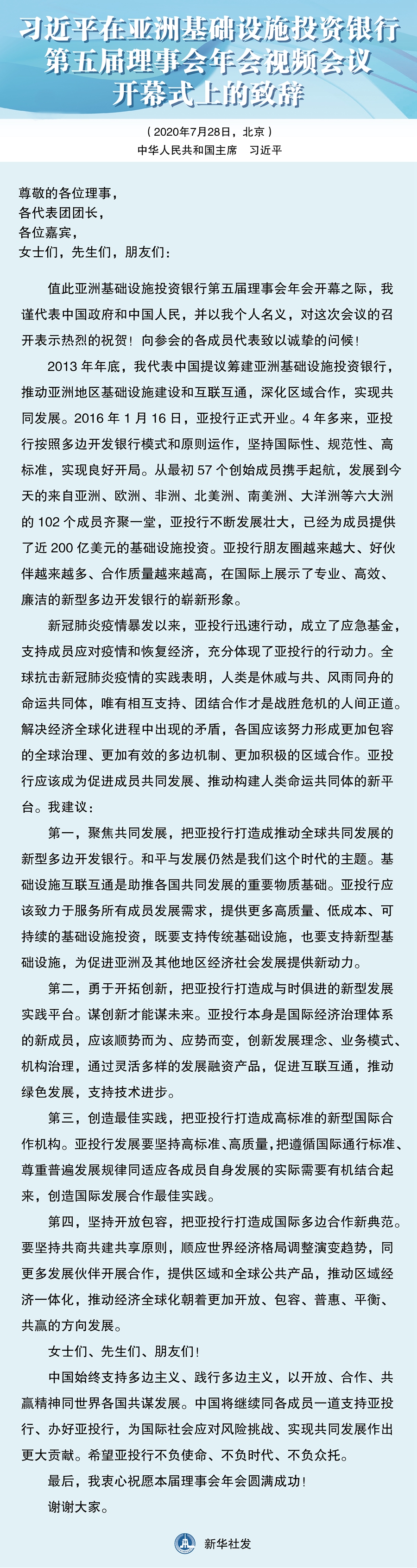在亞洲基礎(chǔ)設(shè)施投資銀行第五屆理事會(huì)年會(huì)視頻會(huì)議開幕式上的致辭