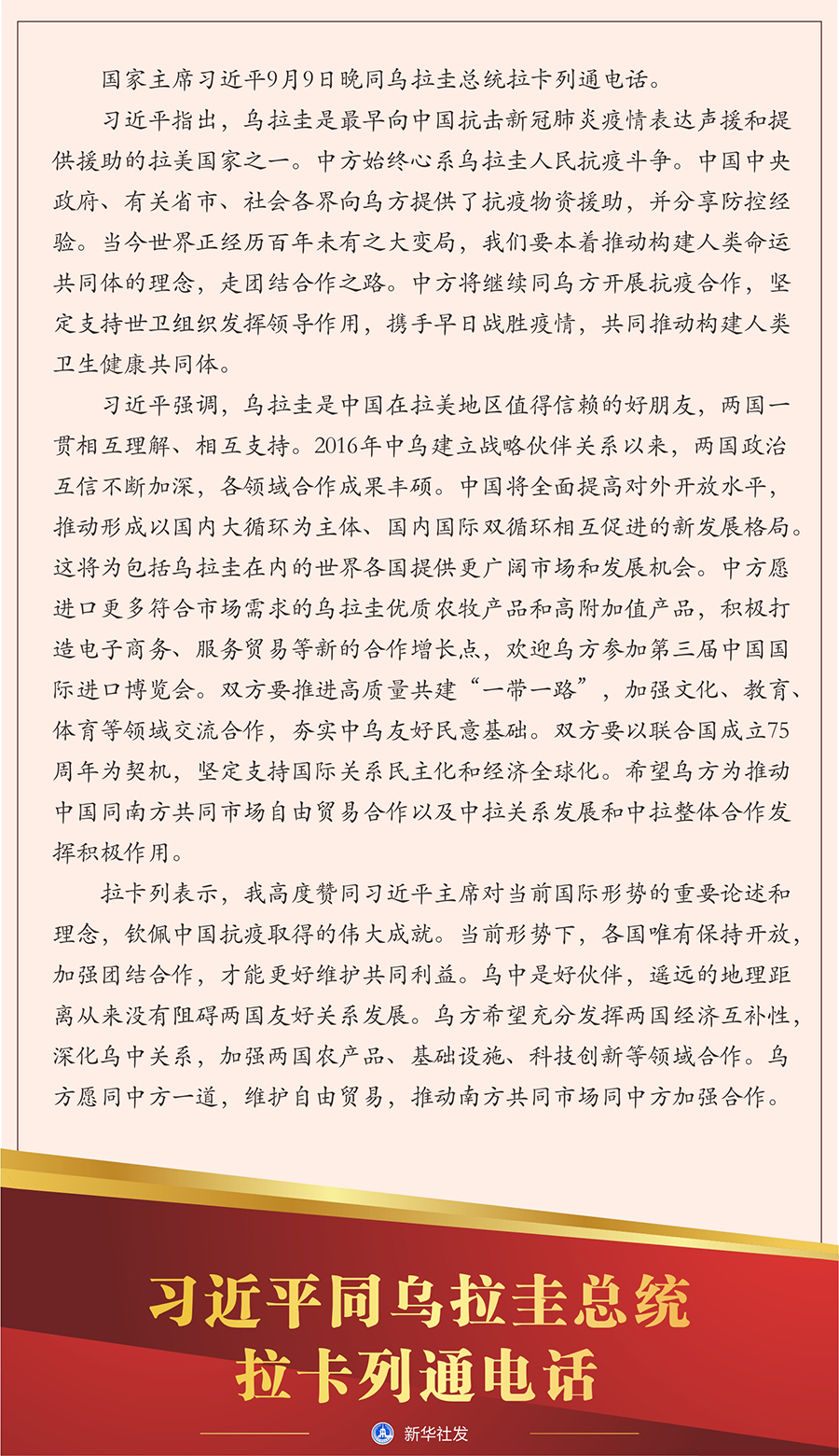 新華社北京9月9日電? 國家主席習近平9月9日晚同烏拉圭總統拉卡列通電話。