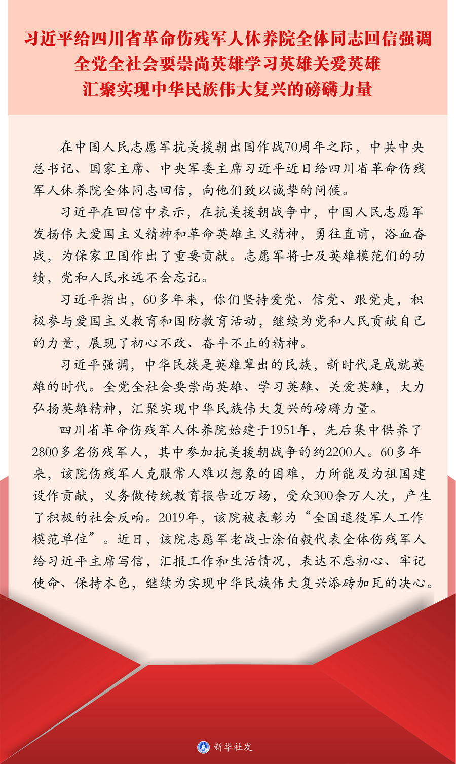 新華社北京10月21日電 在中國人民志愿軍抗美援朝出國作戰(zhàn)70周年之際,中共中央總書記、國家主席、中央軍委主席習(xí)近平近日給四川省革命傷殘軍人休養(yǎng)院全體同志回信,向他們致以誠摯的問候。