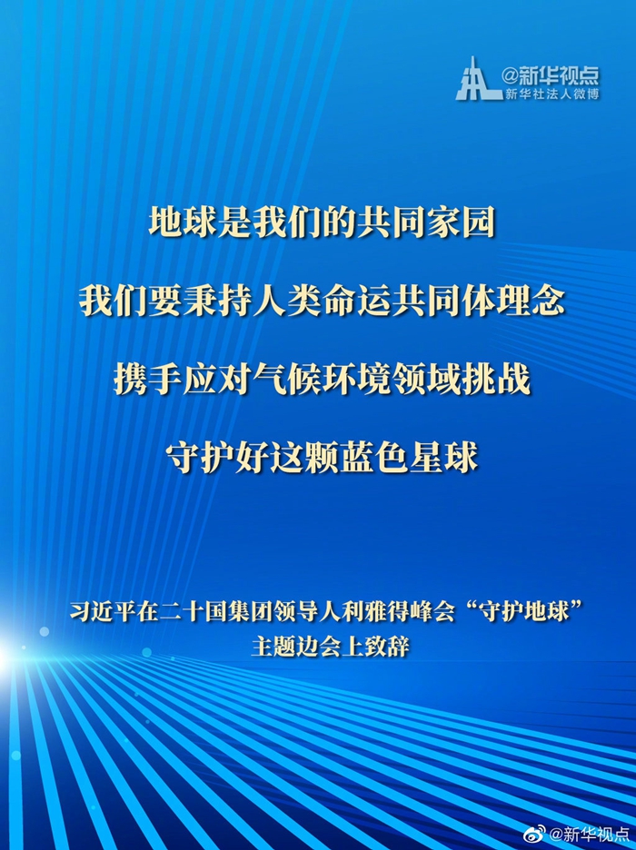 國家主席習近平11月22日在二十國集團領導人利雅得峰會“守護地球”主題邊會上致辭時表示,地球是我們的共同家園。我們要秉持人類命運共同體理念,攜手應對氣候環境領域挑戰,守護好這顆藍色星球。