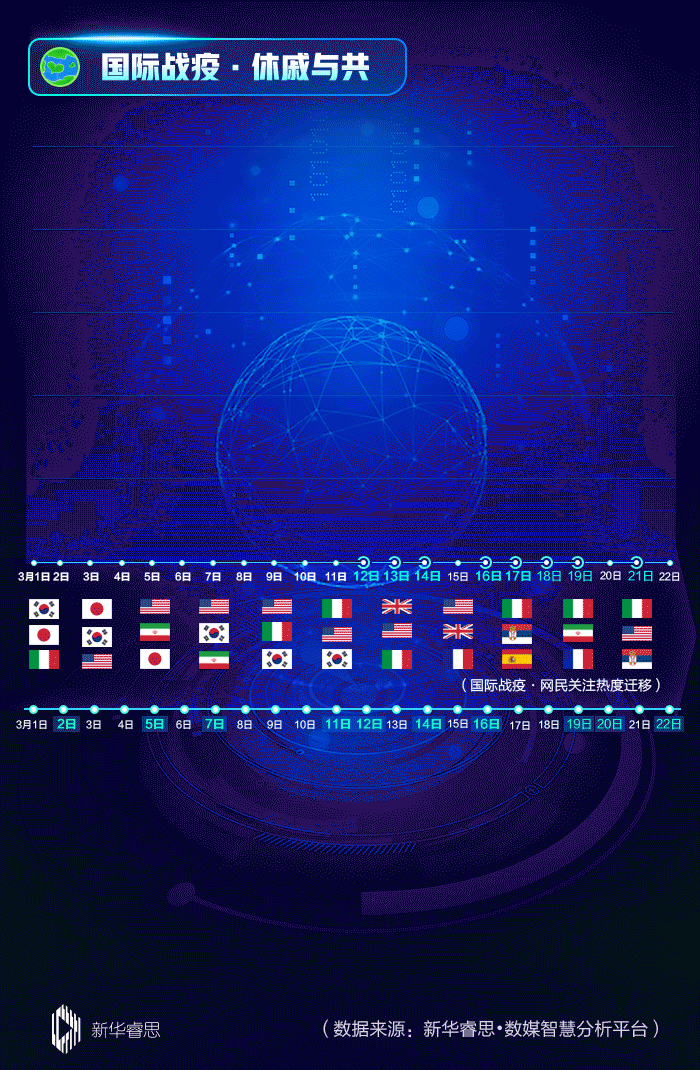 患難見真情。中國以實(shí)實(shí)在在的行動,支援全球抗疫:派遣專家、交流經(jīng)驗(yàn)、共享方案、捐贈物資、聯(lián)合研發(fā)……一個又一個“硬核”舉措,引發(fā)網(wǎng)友高度關(guān)注。新華睿思數(shù)據(jù)顯示,中國派專家組馳援意大利、多國開建“方艙醫(yī)院”等新聞事件,在關(guān)注度曲線上產(chǎn)生較高波動。與此同時,網(wǎng)友持續(xù)關(guān)注著韓國、日本、意大利、美國、伊朗、西班牙等國疫情進(jìn)展。