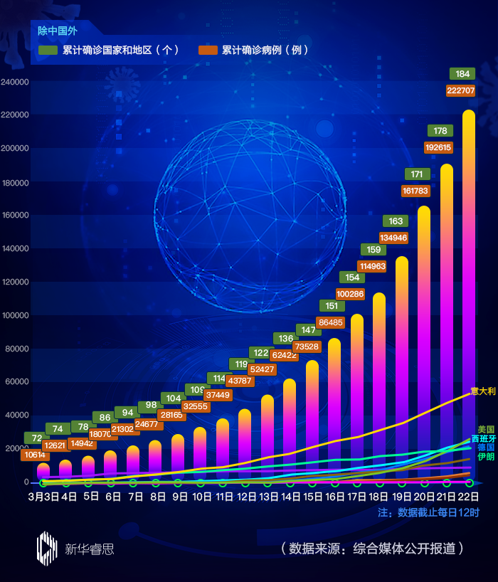 根據(jù)世界衛(wèi)生組織22日公布的最新數(shù)據(jù),中國以外新冠肺炎確診病例20多萬。目前,歐洲已成為疫情“震中”,美國宣布進(jìn)入“國家緊急狀態(tài)”,中東多國“封城”,拉美、非洲多國報告確診病例……隨著新冠肺炎全球確診病例持續(xù)快速增加,網(wǎng)友對全球疫情進(jìn)展情況的關(guān)注度迅速升溫。