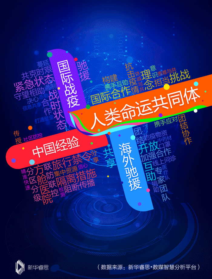 新華睿思持續(xù)跟蹤微博、抖音、今日頭條等網(wǎng)上熱搜榜高熱話題,以及重大新聞事件,梳理出網(wǎng)友關(guān)注的熱詞集錦。根據(jù)關(guān)注度排行可以看出,“人類命運(yùn)共同體”“國際戰(zhàn)疫”“中國經(jīng)驗(yàn)”“海外馳援”四個關(guān)鍵詞位居前列。同時,“國際合作”“戰(zhàn)時狀態(tài)”“方艙醫(yī)院”“共享”“開放”“互助”等成為熱搜詞匯。