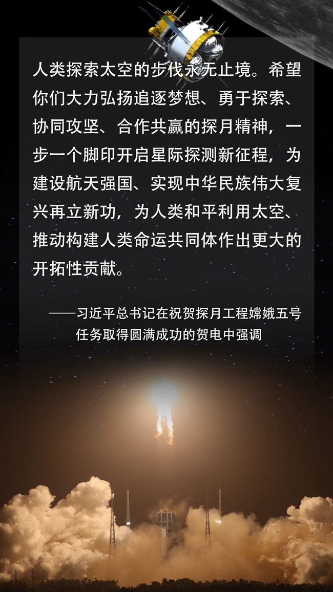 偉大精神燭照奮進征程。探索浩瀚宇宙,是中華民族不懈追求的偉大夢想。嫦娥五號任務的圓滿成功,以及在探月實踐中形成的寶貴精神財富,激蕩起我們科技自立自強的信心與力量,激勵著中國航天人繼續(xù)勇攀高峰。追夢沒有坦途,圓夢唯有實干。我們要牢記總書記重要囑托,大力弘揚探月精神,開啟星際探測新征程,向更加璀璨的星空邁出更堅定的中國步伐,為建設航天強國、實現(xiàn)中華民族偉大復興的中國夢,為人類和平利用太空、推動構建人類命運共同體作出更大的貢獻。
