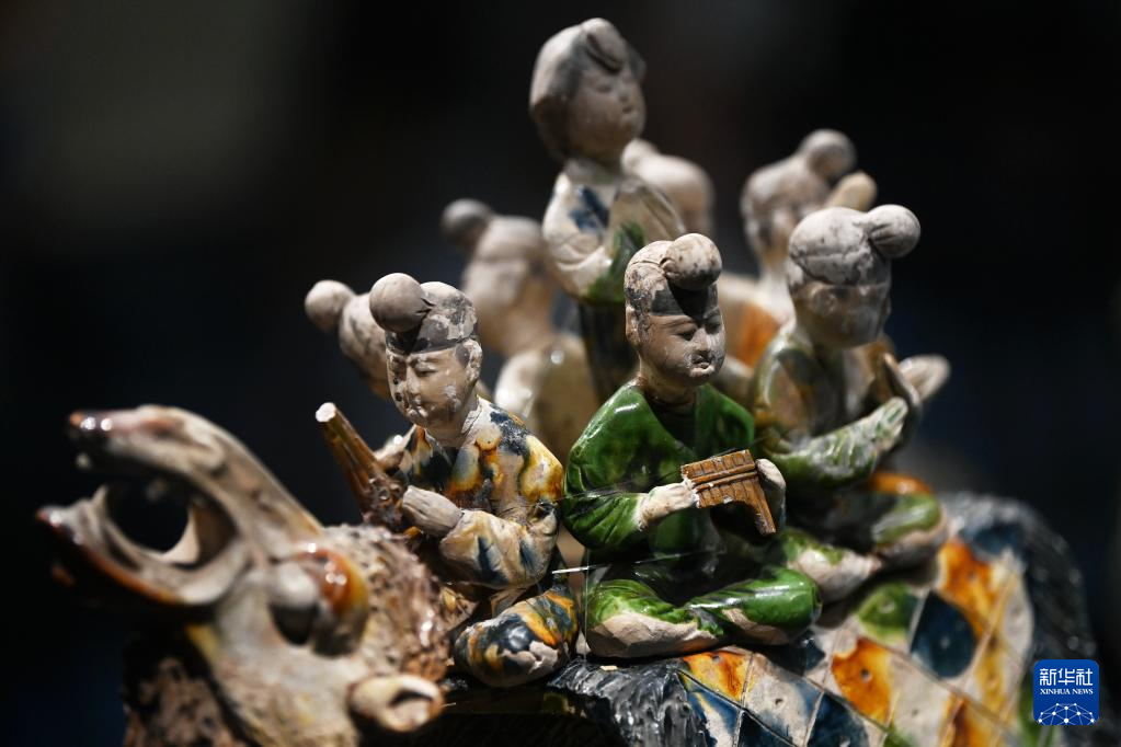 5月11日在陕西历史博物馆拍摄的馆藏唐代文物唐三彩骆驼载乐俑。